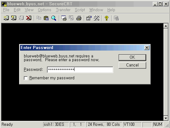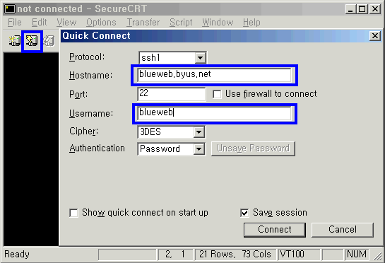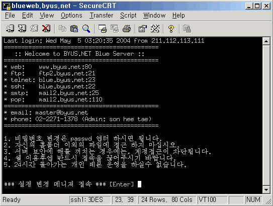 3. °èÁ¤¾ÆÀ̵ð/ºñ¹ø Á¤º¸¸¦ Â÷·Ê·Î ÀÔ·ÂÇÕ´Ï´Ù. 3. ·Î±×Àο¡ ¼º°øÇÏ¸é ¾Æ·¡¿Í °°Àº Á¢¼ÓÈ­¸éÀÌ ³ªÅ¸³³´Ï´Ù. ¿£Å͸¦ Ä¡¸é ¸Þ´ºÈ­¸éÀÌ ³ª¿À°í Åڳݰú ÀÌ¿ë¹æ¹ýÀº µ¿ÀÏÇÕ´Ï´Ù. 4. ÇÊ¿ä¸Þ´ºÀÇ ¹øÈ£³ª ¿µ¹®À» ÀÔ·ÂÈÄ ¿£Å͸¦ Ä¡¸é µË´Ï´Ù. â»çÀÌÁî´Â »óÇÏ,Á¿ì·Î ¸¶¿ì½º·Î ÀûÀýÈ÷ ´Ã·Á ÀÌ¿ëÇÏ½Ã¸é µË´Ï´Ù. ------------------------------------------------------------------------------------------ * °í±Þ ÇÁ·Î±×·¥ÀÎ SecureCRT ¸¦ ÀÌ¿ëÇÏ¿© ssh Á¢¼ÓÀ» ÇÏ½Ç ¼ö ÀÖ½À´Ï´Ù. 1. SecureCRT ¸¦ ½ÇÇà½ÃŲ ÈÄ ¾Æ·¡¿Í °°ÀÌ Quick connect ¹öưÀ» Ŭ¸¯ÇÕ´Ï´Ù. ¾Æ·¡¿Í °°ÀÌ Ç¥½ÃµÈ ºÎºÐ¸¸ ÀÚ½ÅÀÇ Á¤º¸¸¦ ¼öÁ¤/±âÀçÇÕ´Ï´Ù. 2. Á¢¼Ó½Ã Accept&Save È®ÀÎ - ºñ¹Ð¹øÈ£¸¦ Á¤È®È÷ ÀÔ·ÂÈÄ ok ¸¦ Ŭ¸¯ÇÕ´Ï´Ù. 3. ssh Á¢¼ÓÀÌ µÇ¾ú½À´Ï´Ù. ½©¸Þ´ÏÀú, ÄܼÖÀÛ¾÷À» ÇÏ½Ç ¼ö ÀÖ½À´Ï´Ù. 4. ½©Á¾·á½Ã exit [Enter]