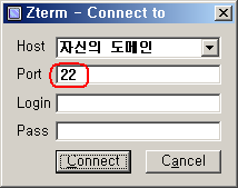 2. Zterm À» ½ÇÇà½ÃŲÈÄ ÀÚ½ÅÀÇ È¨ÆäÀÌÁö ÁÖ¼Ò¸¦ ±âÀçÇÏ°í Æ÷Æ®¹øÈ£¸¦ 22 À¸·Î ¼öÁ¤ÇÕ´Ï´Ù. ¿¹) www.yourdomain.com (o), id.byus.net (o), ( http://abc.com (x) ) ÁÖÀÇ) ÀÔ·Â Á¤º¸´Â Á¢¼Ó½Ã Á¤º¸°¡ pc ÀÇ ·¹Áö½ºÆ®¸®¿¡ ÀúÀåµË´Ï´Ù. °³ÀÎ pc °¡ ¾Æ´Ñ°æ¿ì Àý´ë ¾ÆÀ̵ð/ºñ¹øÀ» ÇÔ²² ³Ö°í Á¢¼ÓÇÏ½Ã¸é ¾ÈµË´Ï´Ù.
